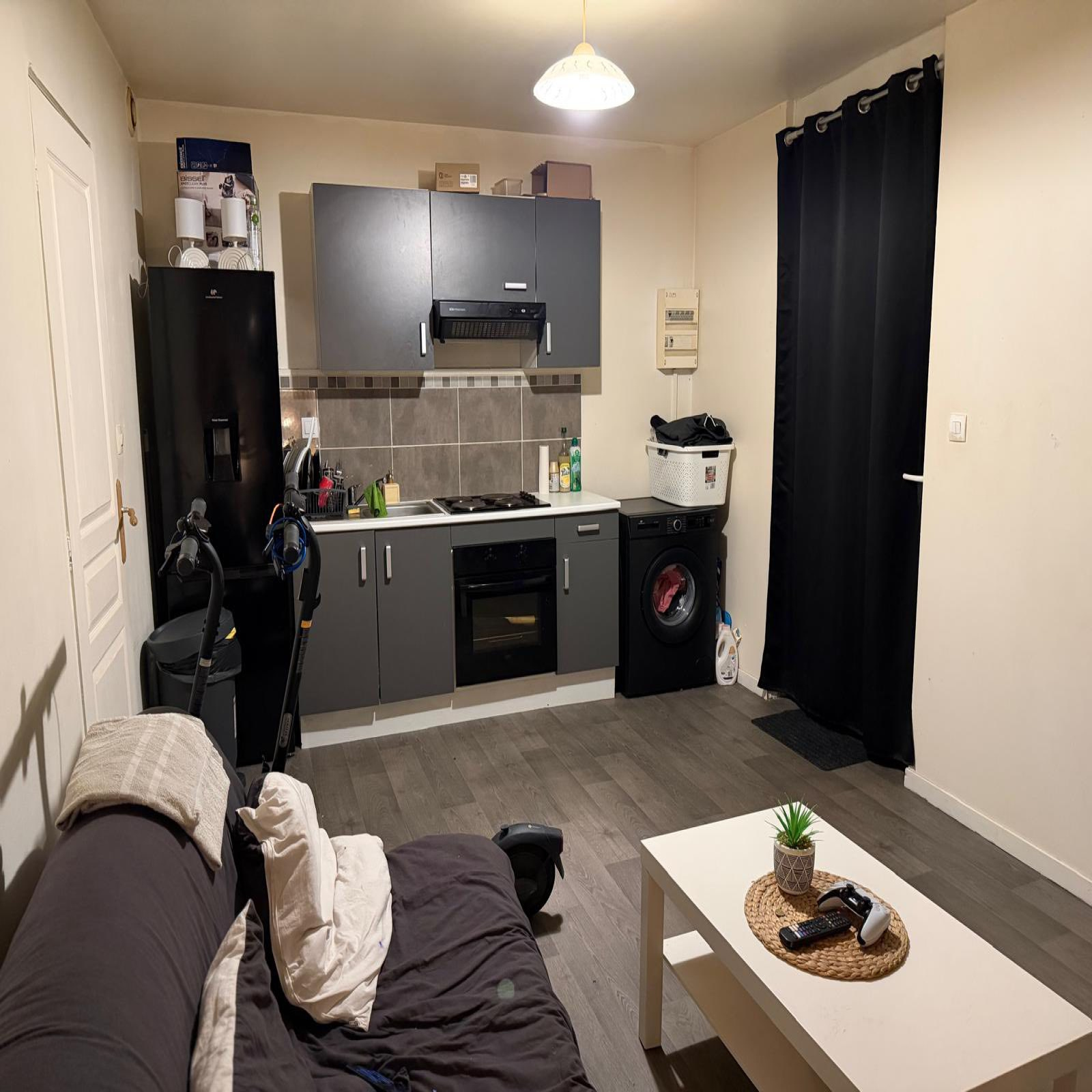 Studio au RDC dans une rue calme comprenant : Une pièce de vie, cuisine équipée, salle d'eau + WC
